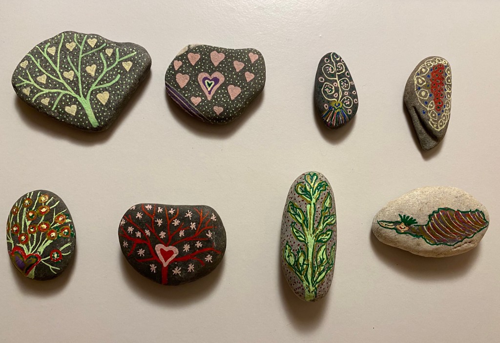 Wir besinnen uns auf uns selber und fangen mit den eingeschränkten Aktivitäten etwas Neues an. Not macht erfinderisch. Ich beobachte in meinem Freundes- und Bekanntenkreis neue Steckenpferde. So werden zum Beispiel die Malutensilien nach einem jahrelangen Dornröschenschlaf wieder ausgegraben. Das spontane Texten, Fabulieren und Tagebuchschreiben bekommt wieder einen Stellenwert; die verstaubte Töpferscheibe im Keller wird hervorgeholt, und bei mir hat sich mittlerweile eine beachtliche Anzahl bemalter Steine angesammelt. Das Bemalen meiner selbst gesuchten See- und Flusssteine wirkt auf mich zentrierend und beruhigend. Mein vagabundierender Geist kommt dabei zur Ruhe, und mein oft zu grosser Medienkonsum wird automatisch eingeschränkt.
