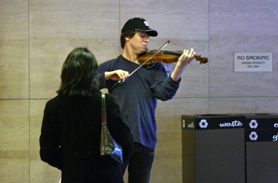Was die Leute nicht wussten: Der vermeintliche Strassenmusiker, der in der U-Bahn-Station die Hektik des Alltags mit wunderbaren Klängen zu verzaubern versuchte, war einer der jungen Stars unter den Geigenspielern – Joshua Bell. Er spielte auf seiner Stradivari-Geige Stücke, die er kurz zuvor in der ausverkauften Bostoner Symphony Hall gespielt hatte.